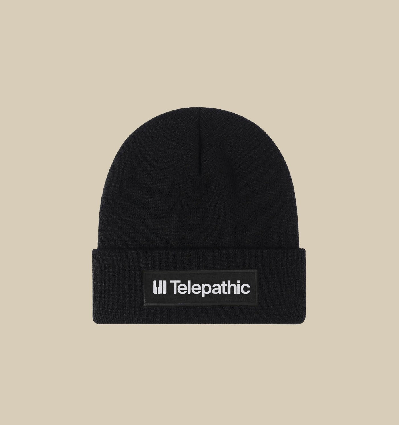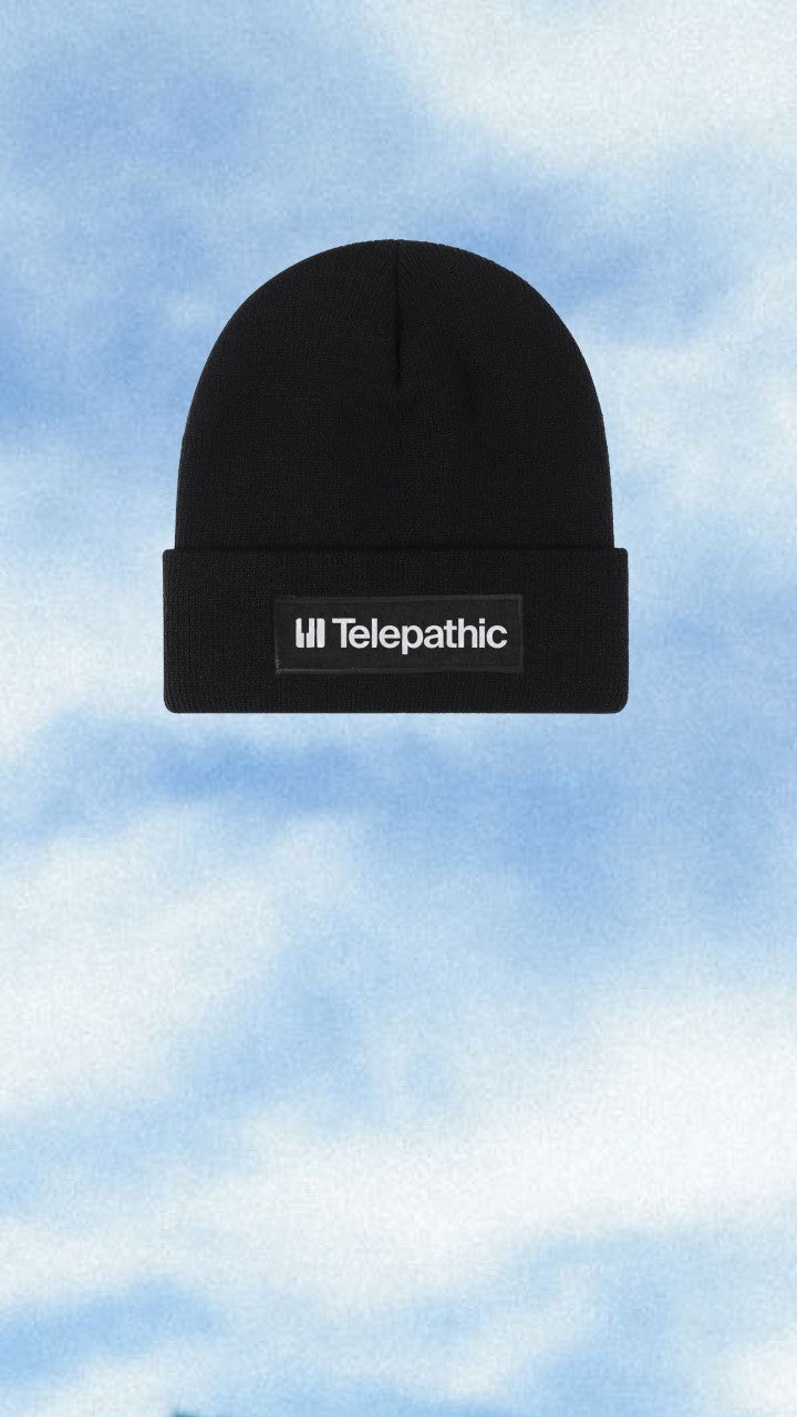 Black knitted beanie with embroidered Telepathic patch.