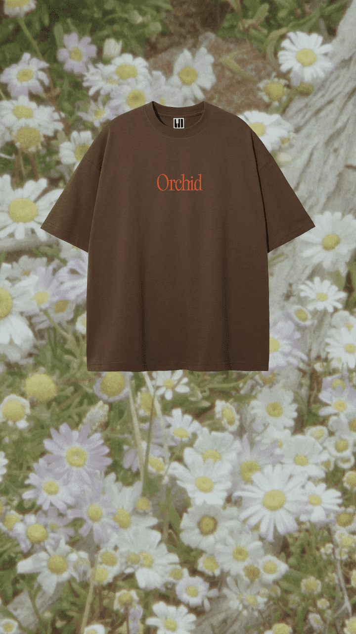 Orchid logo in orange on front. Eye from Orchid display on the back.
